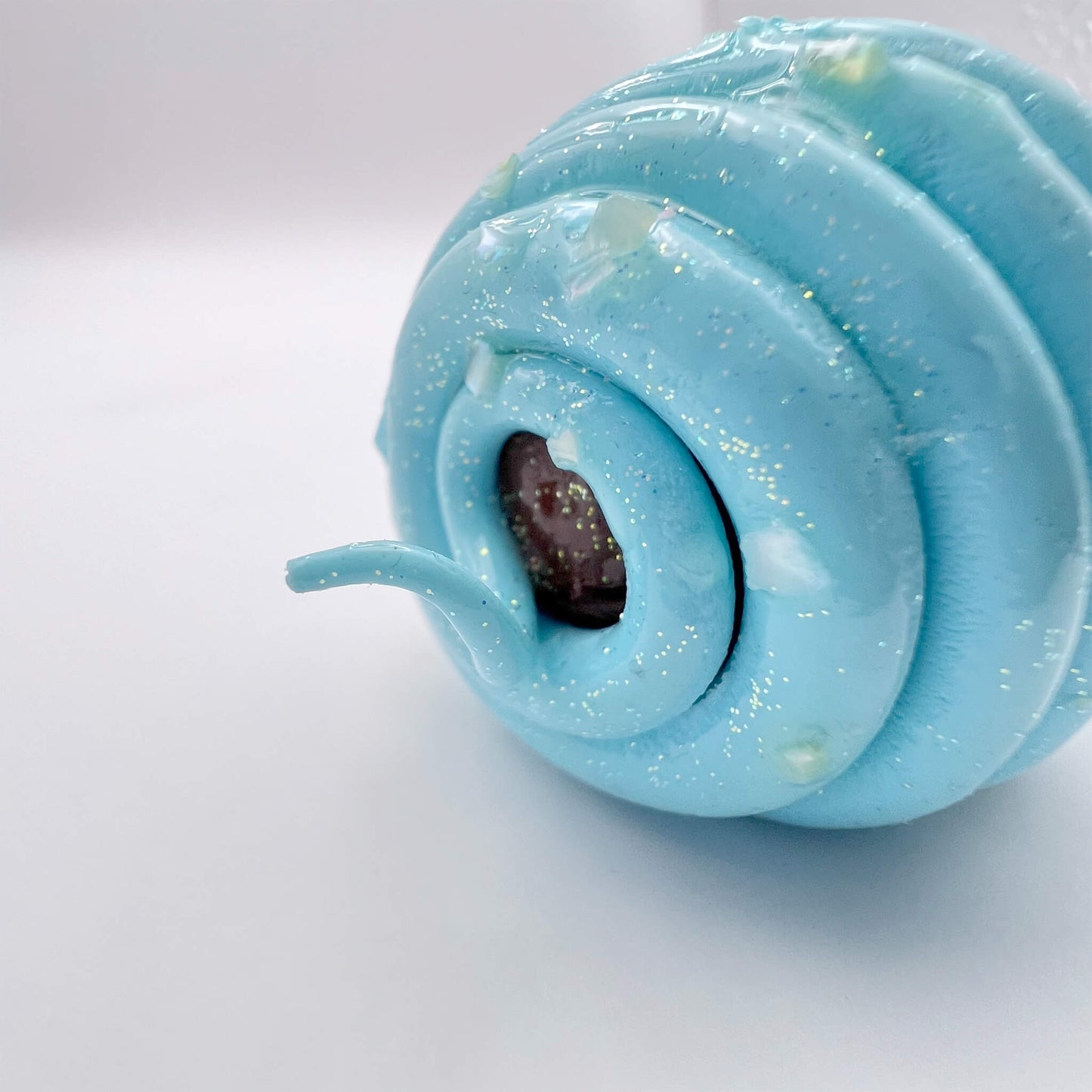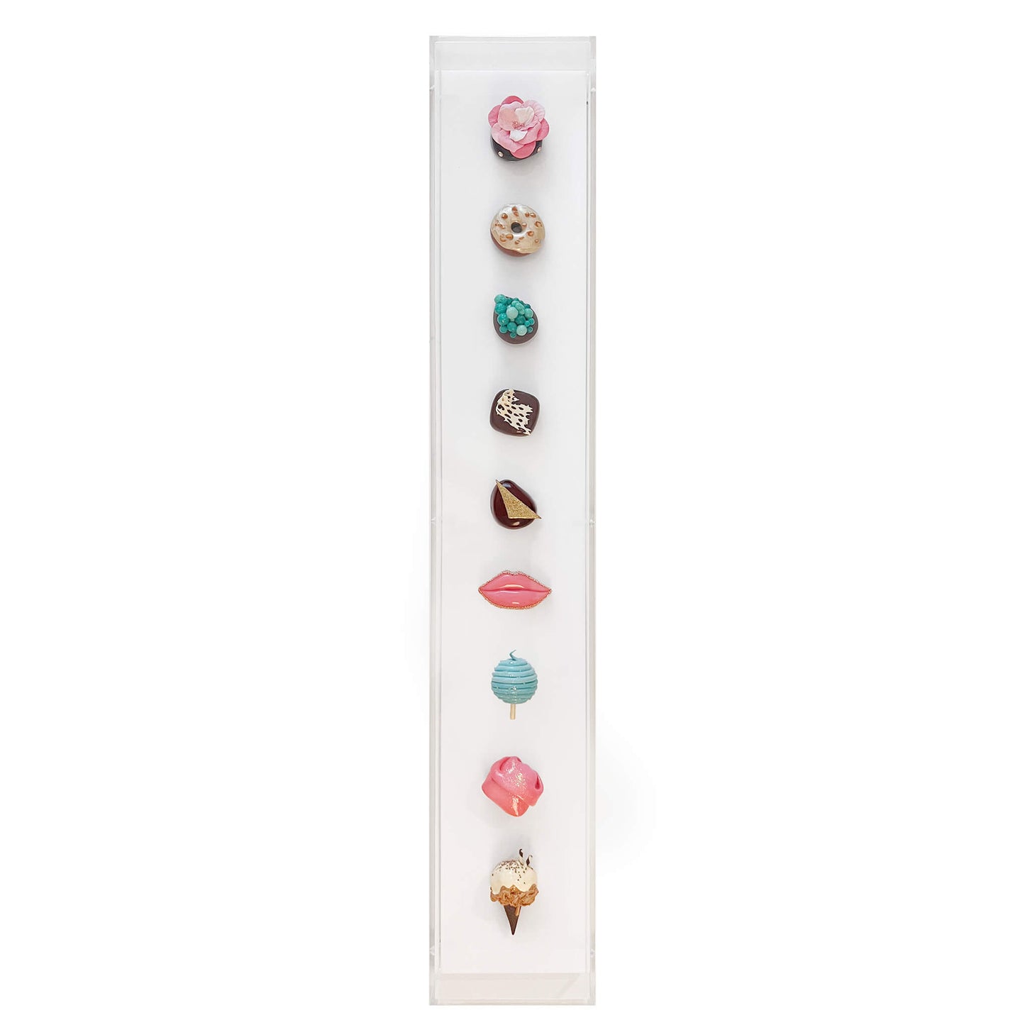 Each chocolate sculpture is mounted on a white acrylic base and protected by a clear acrylic glass cover.